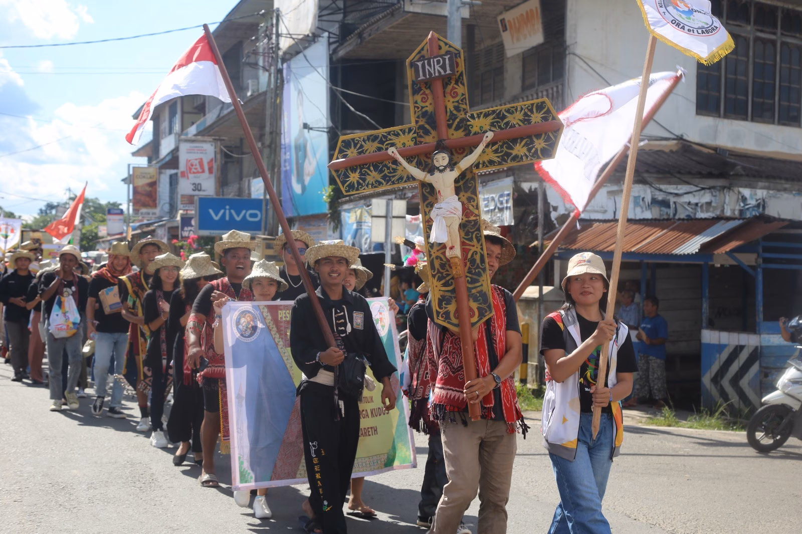 Panas terik matahari tak menyurutkan semangat OMK untuk berdefile dengan aneka ragam kostum dan yel-yel yang telah mereka siapkan. Mereka pun membawa salib dari masing-masing paroki dengan berbagi kisah dan makna untuk nanti dipersembahkan kepada stasi di paroki mereka. Hadir pula marching band dari SMAS Panca Setya Sintang yang menambah kemeriahan defile.
