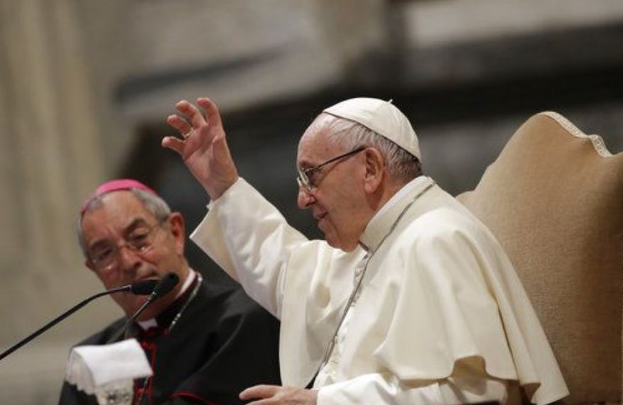 Paus Fransiskus, diapit oleh Kardinal Angelo De Donatis, menyampaikan pidatonya dalam pertemuan dengan Keuskupan Roma, di Basilika St. Yohanes di Lateran, di Roma, Senin, 14 Mei 2018.| Associated Press via Daily Herald