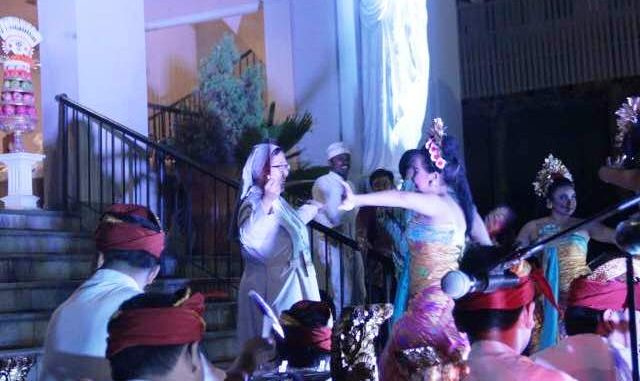 Dalam makan bersama setelah Misa pembukaan Uskup Denpasar, Mgr Silvester San sedikit menceritakan mengenai keuskupannya. Umat Katolik hidup dan berkembang bersama mayoritas masyarakat beragama Hindu. Dengan begitu banyaknya pura yang berdiri di Bali maka pulau ini disebut sebagai “Pulau Dewata†atau pulau tempat tinggal bagi banyak dewa.