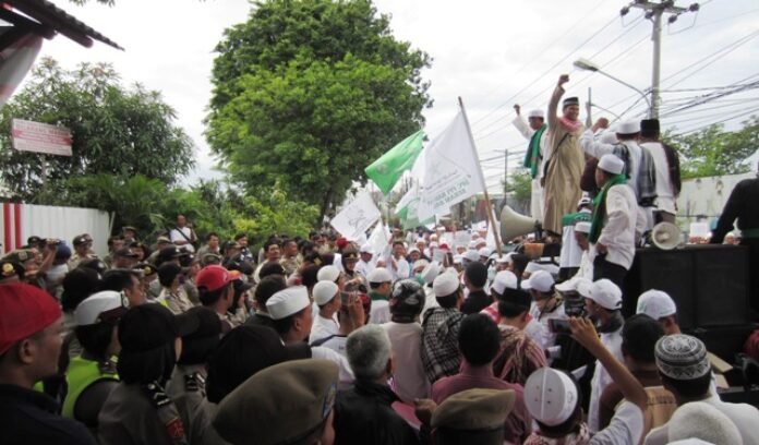 Salah satu orator, Ustad Suhendi Syahroni menyatakan bahwa aksi mereka merupakan aksi damai, bukan menentang Gereja tetapi menentang IMB yang menurut mereka menyalahi aturan. “Kami di sini yang berkumpul tidak anti Gereja atau anti Kristen, kami hanya meminta penegakan hukum dan keadilan. Kami umat Islam tidak membenci gerejanya, kami hanya meminta supaya Surat IMB-nya yang sudah turun dicabut,” ujarnya.
