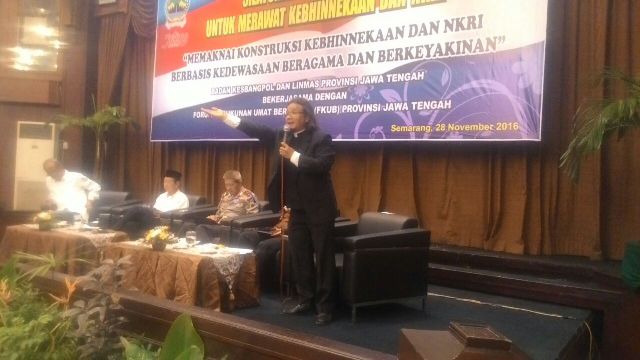 Ada pun yang menjadi narasumber adalah KH Ahmad Daroji (Ketua MUI Jateng), Condro Kirono (Kapolda Jateng), Prof Dr. Mudjahirin Tohir (Ketua FKUB Jateng) dan H. Ahyani (Kemenag Jateng). Semula, KH A Mustofa Bisri (dikenal Gus Mus) juga berkenan menjadi narasumber. Namun karena Senin pagi mendapat kabar duka bahwa Kiai Nafis Misbah Mustofa – adik misanan beliau – dipanggil Tuhan, maka beliau batal hadir karena melayat.
