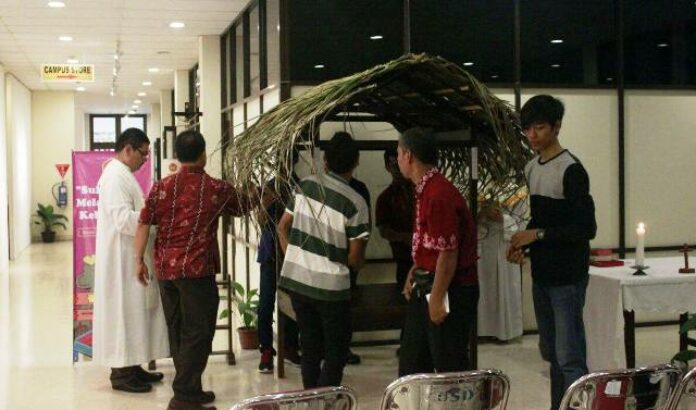 HIDUPKATOLIK.com – ADA yang berbeda di Kampus 5 Universitas Sanata Dharma (USD) Kotabaru, Yogyakarta mulai Kamis, 1/12. Pada pukul 09.00 hari ini, di Hall kampus tersebut terpajang kandang kosong beratap jerami. Menurut Koordinator Spiritualitas dan Kerumahtanggaan Kampus 5 USD Romo Bernardus Rukiyanto SJ, kandang kosong yang ditempatkan di hall tersebut merupakan salah satu program Campus Ministry USD dalam menyambut masa Adven dan Natal 2016.
