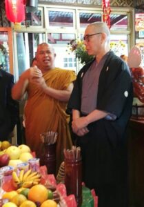 Romo Simon yang saat kunjungan berlangsung mengenakan busana ala kimono Jepang ini rupanya juga sudah mempersiapkan diri dengan mengenakan busana itu. “Dengan memakai pakaian kimono ini badan bisa lebih hangat dan nyaman sebab cuaca di Cipanas cukup dingin. Dengan baju kimono, Meditasi Zen yang saya lakukan juga lebih nyaman dan cocok dengan nuansa Wihara Buddha di tempat ini,†jawab Romo Simon sambil mengirimkan fotonya bersama Bante Arya yang sama-sama gundul.