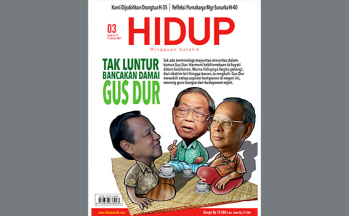 HIDUPKATOLIK.com – GUS Dur selalu dikenang. Ribuan orang, termasuk Kardinal Darmaatmadja dan Mgr Suharyo, hadir dalam haul ketujuh wafatnya mantan Presiden RI ini menjelang Natal lalu. Jika Gus Dur masih hidup hari ini, kira-kira apa yang akan dia katakan tentang Indonesia? Lelucon apa yang akan ia lontarkan? Simak Sajian Utama edisi ini!