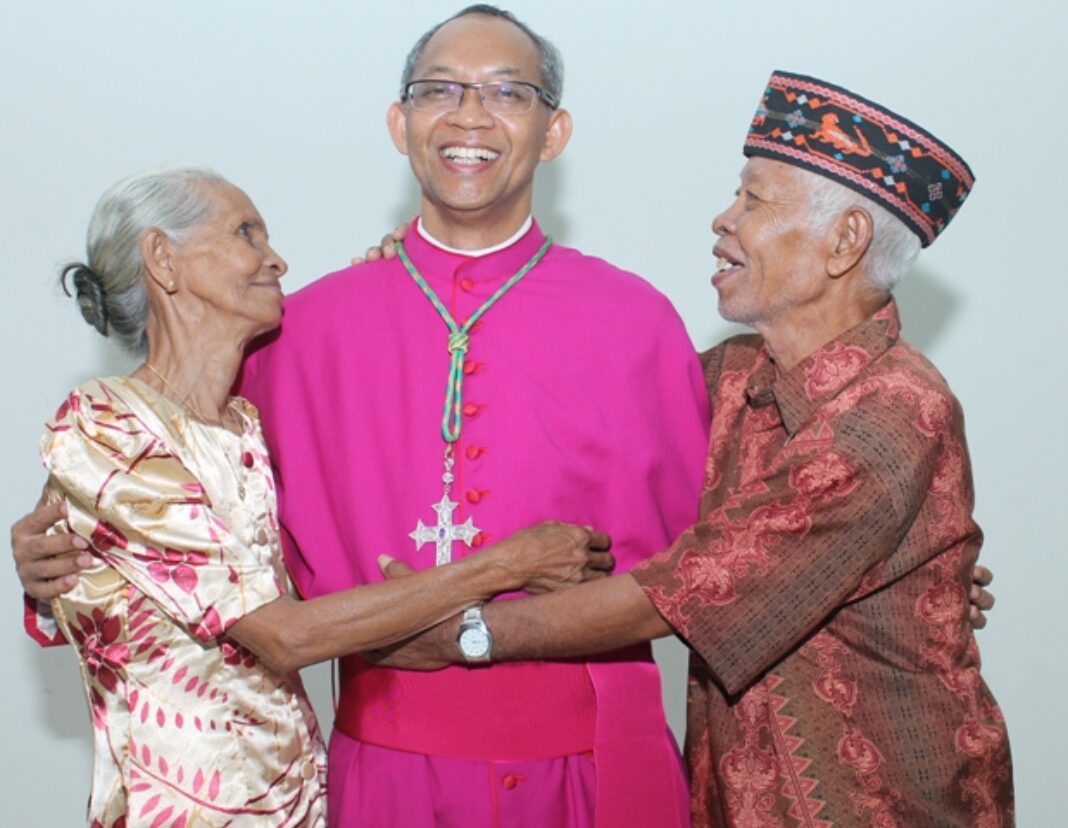 HIDUPKATOLIK.COM-SENYUM haru terpancar diri bibir ibu Hilaria Kambaria dan suami Yohanes Dani ketika putera mereka Mgr Paskalis Bruno Syukur OFM ditabiskan menjadi Uskup Keuskupan Bogor di Sentul International Convention Centre (SICC) pada 2014 lalu. Orangtuanya bahagia karena Misa tahbisan ini dihadiri 41 Uskup dari seluruh dunia dan sekitar 200 iman dari dalam dan luar negeri. Upacara pentahbisan ini bertepatan dengan Pesta Takhta St Petrus dipimpin oleh Uskup Emeritus Bogor Mgr Mikhael Cosmas Angkur OFM didampingi Uskup Agung Jakarta Mgr Ignatius Suharyo sebagai penahbis pertama yang juga menjabat sebagai Ketua Konferensi Waligereja Indonesia (KWI) dan Uskup Ruteng Mgr Hubertus Leteng sebagai penahbis kedua.