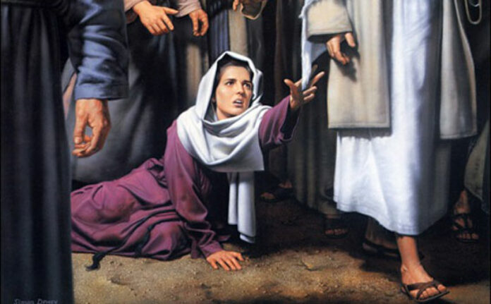 Mrk 5:33 Perempuan itu, yang menjadi takut dan gemetar ketika mengetahui apa yang telah terjadi atas dirinya, tampil dan tersungkur di depan Yesus dan dengan tulus memberitahukan segala sesuatu kepada-Nya.