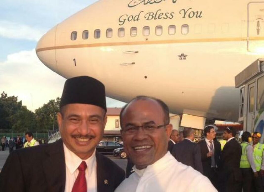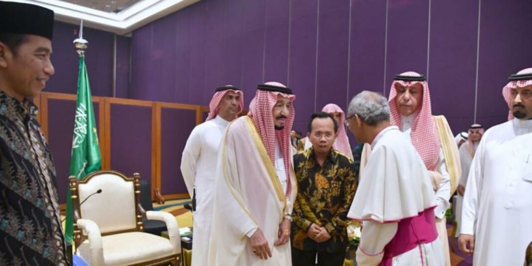 TIGA uskup terlihat mengenakan busana nyaris seragam saat hadir dalam pertemuan para tokoh lintas agama dengan Presiden Jokowi dan Raja Arab Saudi Salman bin Abdul Aziz al-Saud, di Hotel Raffles, Kuningan, Jakarta Selatan, Jumat, 3/3. Datang mewakili Konferensi Waligereja Indonesia (KWI), Ketua KWI Mgr Ignatius Suharyo, Sekretaris Jenderal KWI Mgr Antonius Subianto Bunyamin OSC, dan Uskup Bogor sekaligus Ketua Komisi Kateketik KWI Mgr Paskalis Bruno Syukur OFM, memakai jubah putih dengan berbagai atribut.