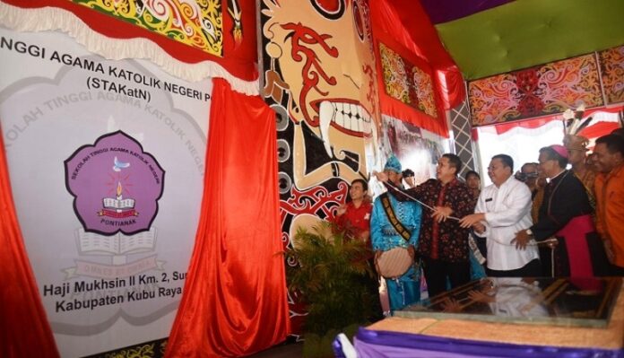 HIDUPKATOLIK.com – MENTERI Agama (Menag) Lukman Hakim Saifuddin meresmikan Sekolah Tinggi Agama Katolik Negeri (STKatN) Negeri Pontianak yang beralamatkan di Jl. Parit Haji Muksin, Kabupaten Kubu Raya, Kamis, 6/4. Peresmian ditandai dengan pembukaan tirai dan penandatanganan prasasti STAKatN yang dilakukan oleh Menag, Gubernur Kalimantan Barat (Kalbar) Cornelis, dan Uskup Agung Pontianak Mgr Agustinus Agus.
