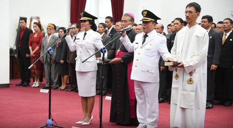 Tampak dalam video itu, saat pengambilan sumpah, Karolin didampingi Uskup Agung Pontianak Mgr Agustinus Agus yang khusus memegang Alkitab sebagai tempat tumpuan tangan Karolin saat mengucapkan sumpahnya. “Dengan sebaik-baiknya dan seadil-adilnya, akan memegang teguh UUD 1945 dan menjalankan segala undang-undang dan peraturannya dengan selurus-lurusnya serta berbakti kepada masyarakat, nusa dan bangsa, semoga Tuhan menolong saya,†ungkap Karolin dan Heriadi dengan tegas.