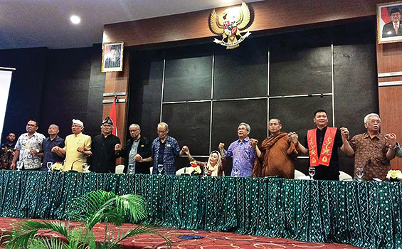 LEBIH dari dua jam, tiga belas tokoh nasional lintas agama dan budayawan duduk bersama untuk menyusun seruan perdamaian Indonesia, di kompleks Universitas Gadjah Mada Yogyakarta, Jumat, 26/5. Para tokoh yang tergabung dalam Forum Sesepuh Bangsa untuk perdamaian Indonesia ini antara lain Buya Syafi’i Maarif, Kardinal Julius Darmaatmadja SJ, Shinta Nuriyah Wahid, Abdul Munir Mulkhan, Pendeta Gomar Gulton, Bhikku Nyana Suryanadi, dan Mohammad Sobary.