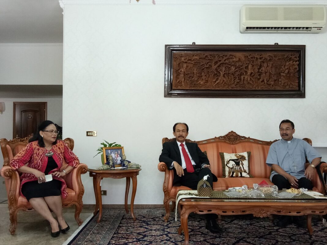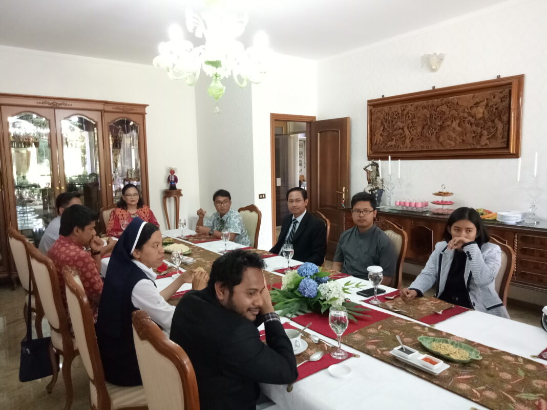 Mgr Rubi merasakan sapaan yang penuh kehangatan dari Duta Besar dan segenap staf kedutaan. Mgr Rubi mengungkapkan juga apresiasinya atas upaya-upaya pemerintah Indonesia membangun relasi dengan Gereja Katolik dan Sri Paus. Acara dilanjutkan dengan ramah tamah. Setelah itu, Mgr Rubi dan rombongan diantar Agus mengelingi kompleks kedutaan dan kantor-kantor pelayanan.