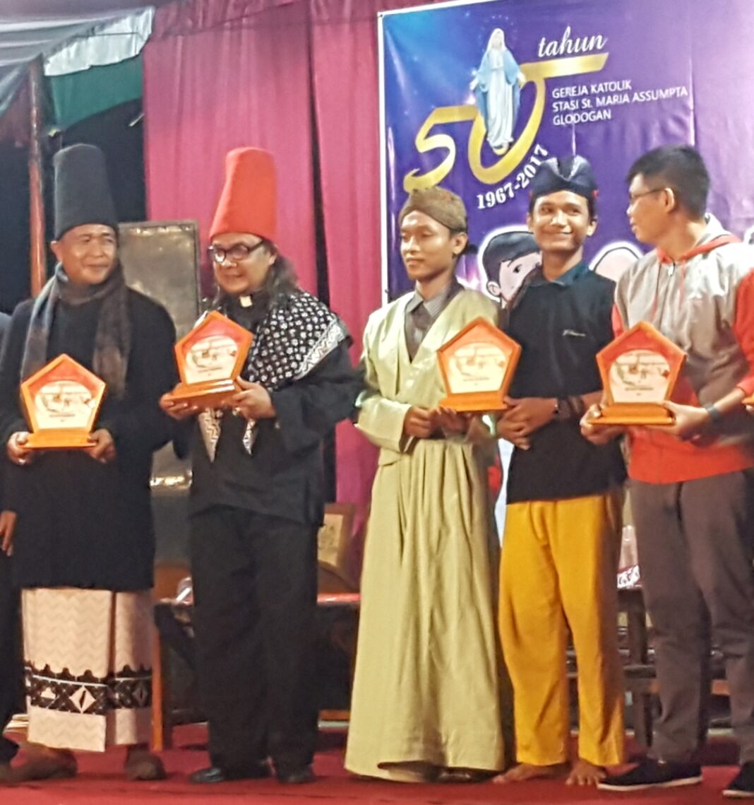 Kiai Sentet, Romo Budi, Sodiq, Ilham dan Chris John dalam acara Pesta Emas Gereja Stasi Glodogan. (Dok. Komisi HAK-KAS).