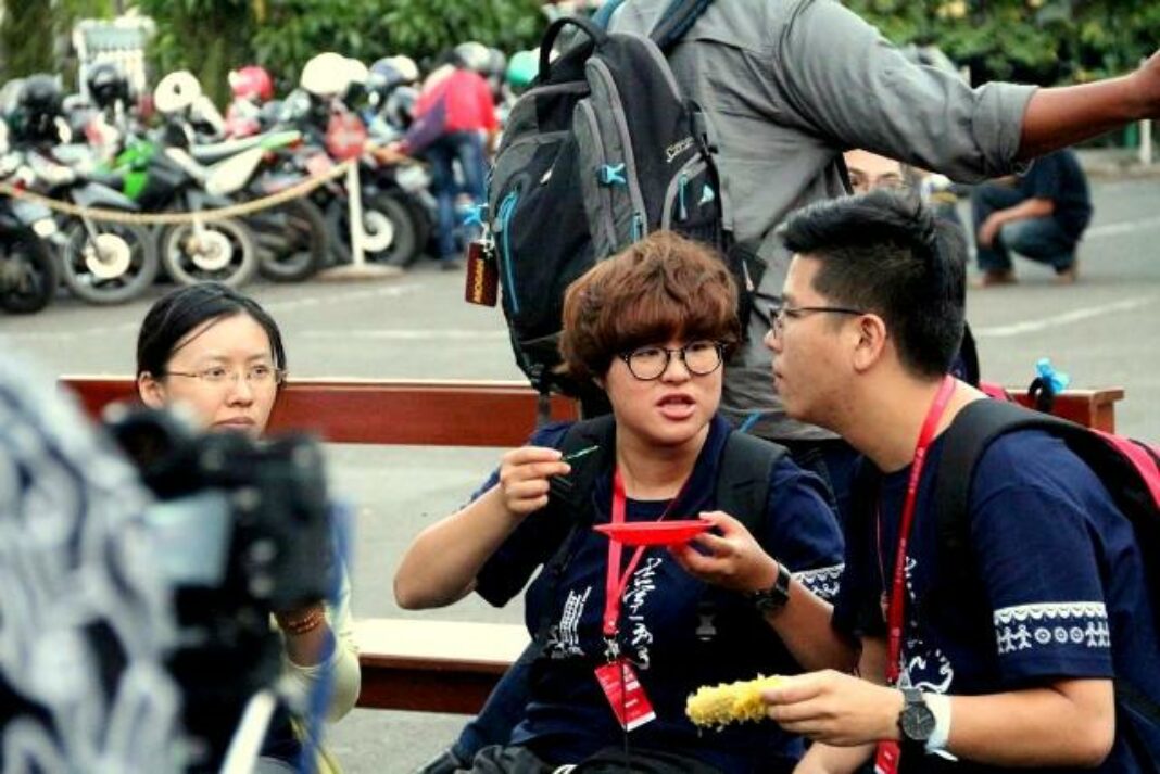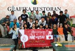 Peserta AYD asal Jepang berfoto bersama pada saat beristirahat di Grafika Restoran Yogyakarta, sebelum melanjutkan perjalanan ke Purwokerto. [www.komkeppurwokerto.net]