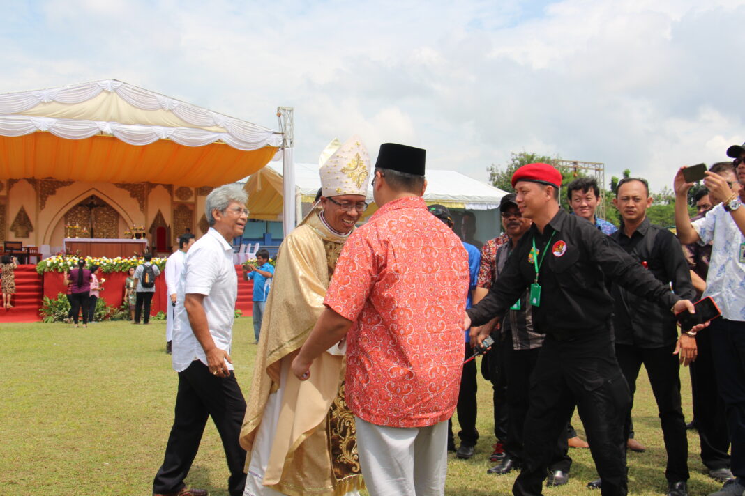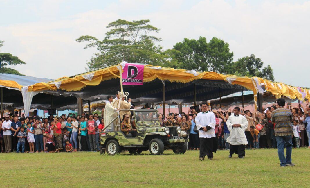 SEKITAR 15.000 umat Keuskupan Pangkalpinang dan umat luar keuskupan menghadiri pentahbisan Mgr Adrianus Sunarko OFM, gembala baru Keuskupan Pangkalpinang, di stadion Depati Amir, Sabtu, 23/9. Mereka datang dari pulau-pulau untuk menyambut sang gembala yang memiliki moto episkopal “Hendaknya Pulau-Pulau Bersukacita.”