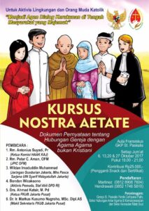 HIDUPKATOLIK.com – SEKSI Hubungan Antar Agama dan Kemasyarakatan (HAAK) bersama Seksi Kerasulan Kitab Suci (KKS) Paroki St Paskalis Cempaka Putih, Jakarta Pusat akan mengadakan kursus Nostra Aetate untuk para aktivis Lingkungan dan orang muda Katolik. Kursus dokumen Deklarasi tentang Hubungan Gereja dengan Agama-Agama Bukan Kristiani ini akan digelar dalam empat kali pertemuan, pada 6,13, 20, dan 27 Oktober 2017 pukul 19.00-21.00 WIB di aula Lantai 2 Gedung Karya Pastoral Gereja St Paskalis Cempaka Putih.