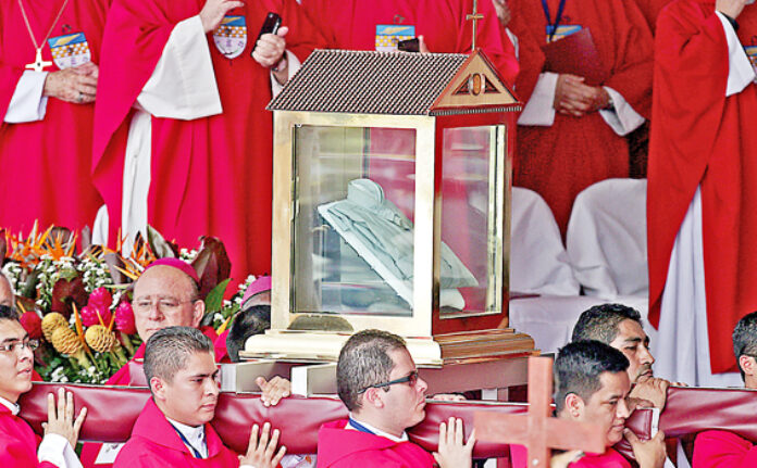 Delapan imam mengusung kotak kaca berisi relikwi Romero menuju altar. Relikwi ini berupa kemeja bersimbah darah yang di kenakan Romero ketika ia ditembak. Selama relikwi diarak, beberapa imam berusaha mengulurkan tangan untuk menyentuh kotak kaca tersebut dan kemudian membuat tanda salib. Demikian diberitakan Catholicherald (24/5).