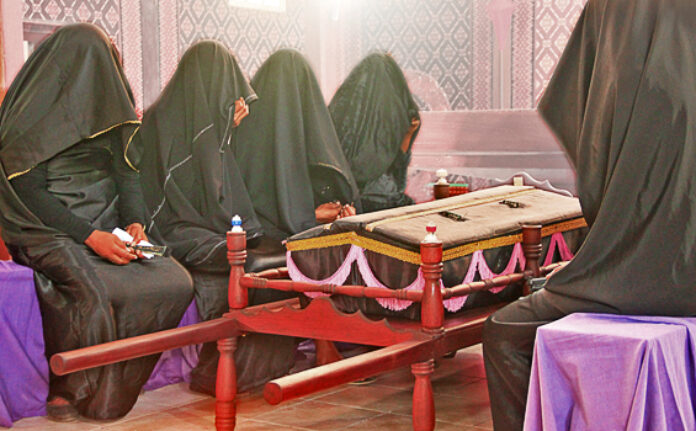 Sekelompok perempuan mengenakan jubah berwarna hitam dengan tudung kepala berwarna senada nampak duduk berhadapan di dekat tandu peti di Kapel Senhor. Kapel Senhor berdiri sekitar 2001 dan berada di dekat Gereja St Ignatius Loyola Sikka, Keuskupan Maumere. Selain itu, terlihat empat orang berpakaian adat Sikka, yang disebut Lipa Lesu, dengan warna pakaian hitam, kain sarung berwarna gelap dan destar sebagai ikat kepala.