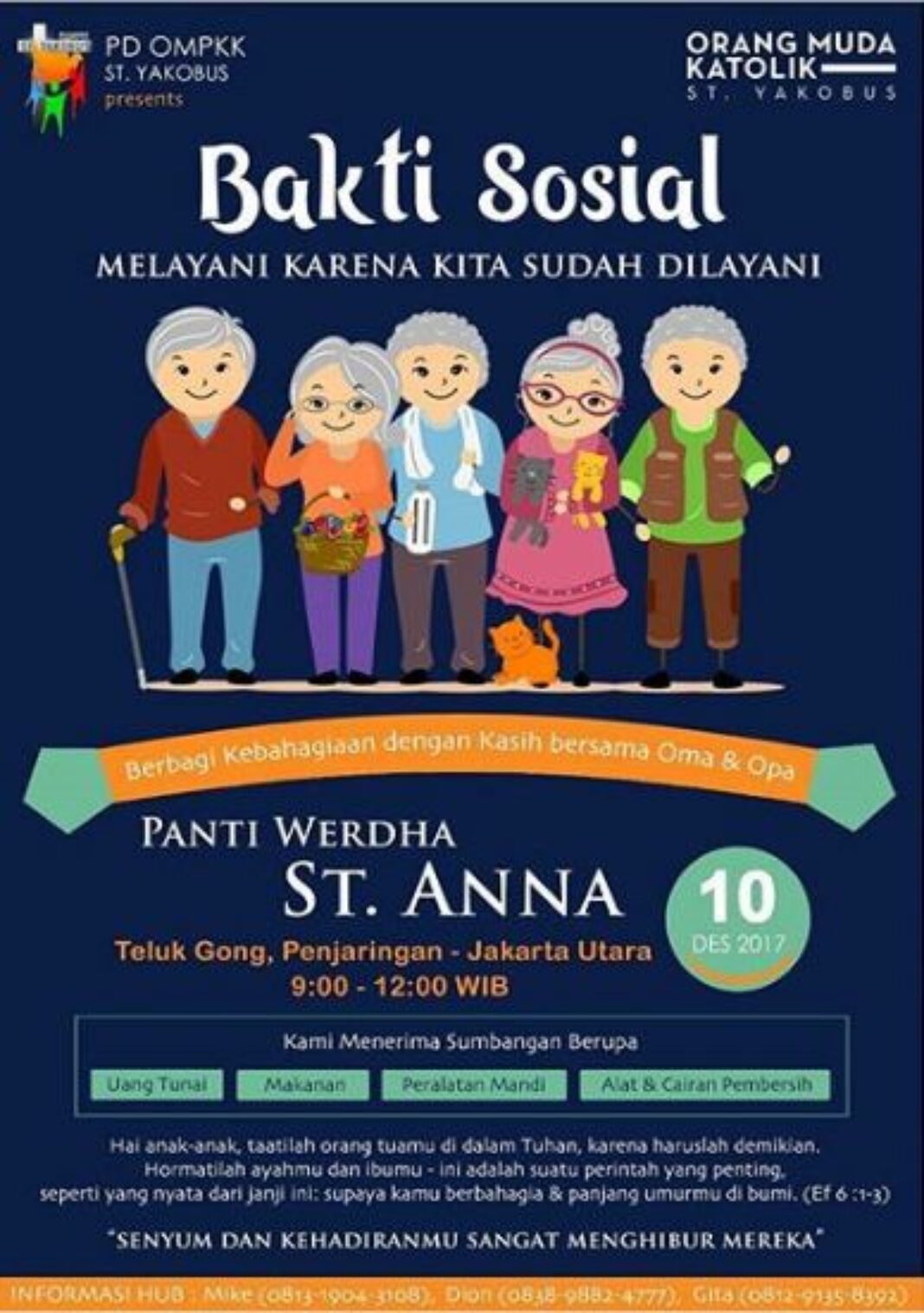 HIDUPKATOLIK.COM – Menyambut Hari Natal, PD OMPKK St. Yakobus mengajak umat Katolik untuk berbagi kasih dalam Bakti Sosial dengan oma opa di Panti Werdha St. Anna, yang akan diadakan pada: