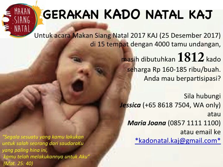 Dalam semangat itulah, tahun ini kita akan melanjutkan Gerakan Makan Siang Natal. Dari sekitar 3910 orang tamu yang akan kita jamu, ada 1812 orang yang menginginkan kado khusus. Tidak mahal, hanya Rp 160- 180 ribu saja per kado. Kami sudah mempunyai daftarnya.