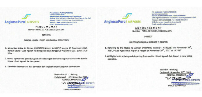 Sementara nota sebelumnya pada tanggal 27 November 2017 menyebutkan dalam suratnya (diterjemahkan dari bahasa Inggris), bandara I Gusti Ngurah Rai sempat ditutup pada tanggal 27 November 2017 pukul 07.15 WITA hingga 28 November pukul 07.00 WITA (dan sempat diperpanjang 24 jam sampai Rabu (29/11/2017) pukul 07.00 Wita, sehubungan dengan debu vulkanik (akibat dari letusan) Gunung Agung di wilayah Karangasem, Bali.