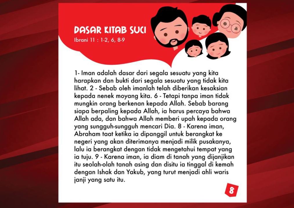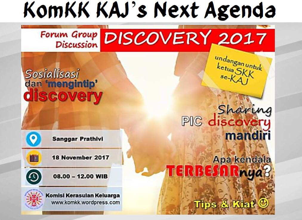 KomKK-KAJ telah melakukan sosialisasi di beberapa gereja KAJ, bekerjasama dengan Seksi Kerasulan Keluarga, menawarkan bahan renungan bersama. Kita akan diajak untuk menciptakan situasi damai dan penuh toleransi sebagai warga negara Indonesia. Bangsa yang berdasarkan Pancasila ini akan menerima keselamatan dan kesejahteraan jika setiap warga negaranya bersaudara dalam membangun masa depan sesuai cita-cita para pendiri bangsa.