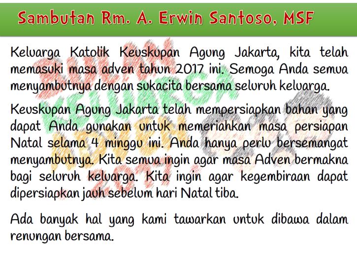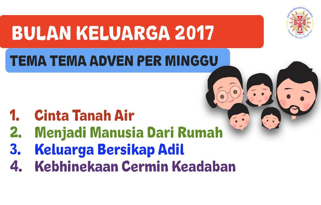 HIDUPKATOLIK.COM – “Kebhinnekaan Berawal Dari Keluarga”, demikian tema Bulan Keluarga 2017 serta untuk menyambut masa Adven yang diangkat oleh Komisi Kerasulan Keluarga (KomKK-KAJ) yang telah mempersiapkan bahan renungan yang dapat digunakan oleh umat untuk persiapan masa Natal selama 4 minggu ini berupa buku bahan pertemuan untuk Keluarga, Komunitas, lingkungan, Wilayah dan Paroki.