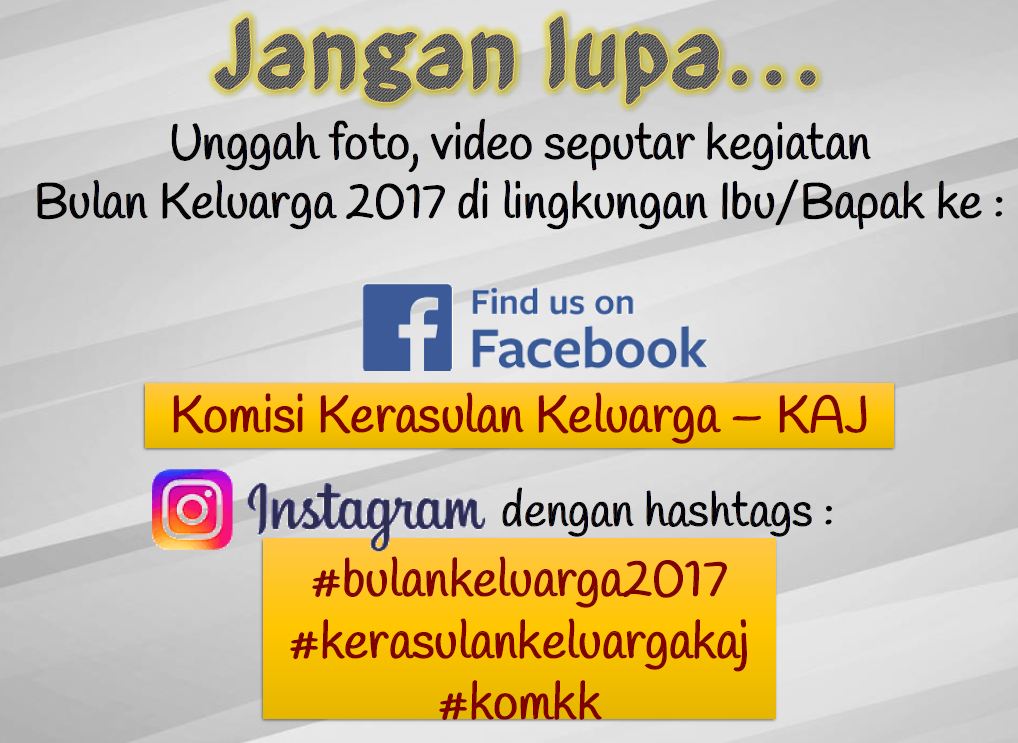 Sosialisasi Bulan Keluarga 2017 telah dimulai oleh KomKK-KAJ sejak Oktober lalu di dekenat Bekasi, yang diadakan di Paroki St. Albertus, Harapan Indah. Romo Alexander Erwin Santoso, MSF selaku Ketua KomKK-KAJ, dalam paparannya menyampaikan beberapa tujuan dari sosialisasi (dibagi ke dalam lima hal) yaitu persiapan Natal, situasi damai sejahtera bagi bangsa, membangun hidup bersama yang edukatif, membawa kesadaran akan kebhinekaan dan merenungkan Sabda Tuhan secara aktif.