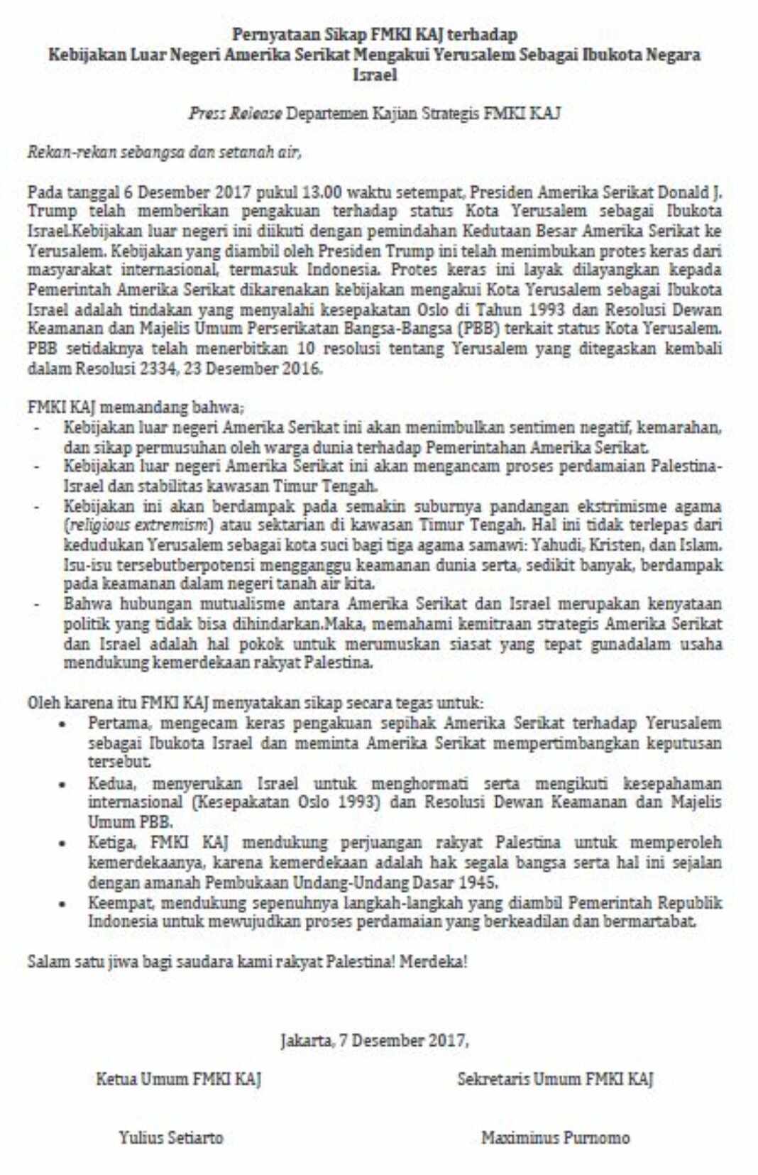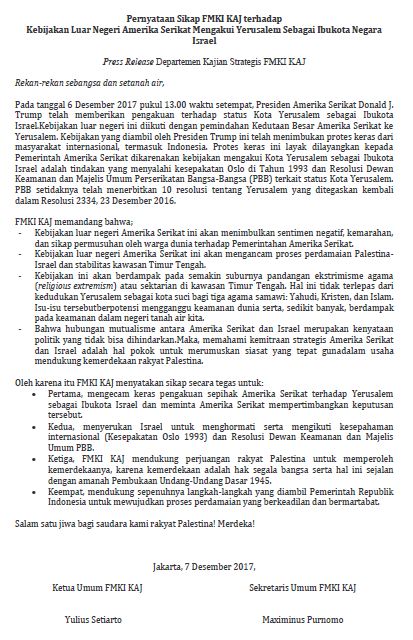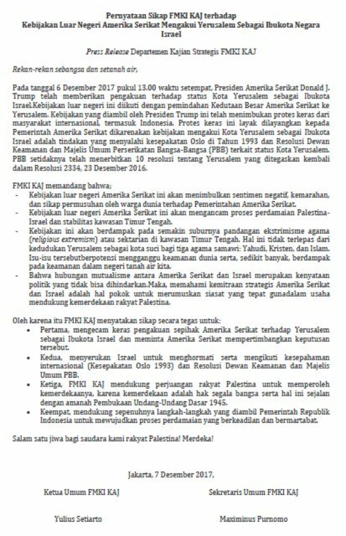 Pernyataan Sikap FMKI (Forum Masyarakat Katolik Indonesia) KAJ terhadap Kebijakan Luar Negeri Amerika Serikat Mengakui Yerusalem Sebagai Ibukota Negara Israel