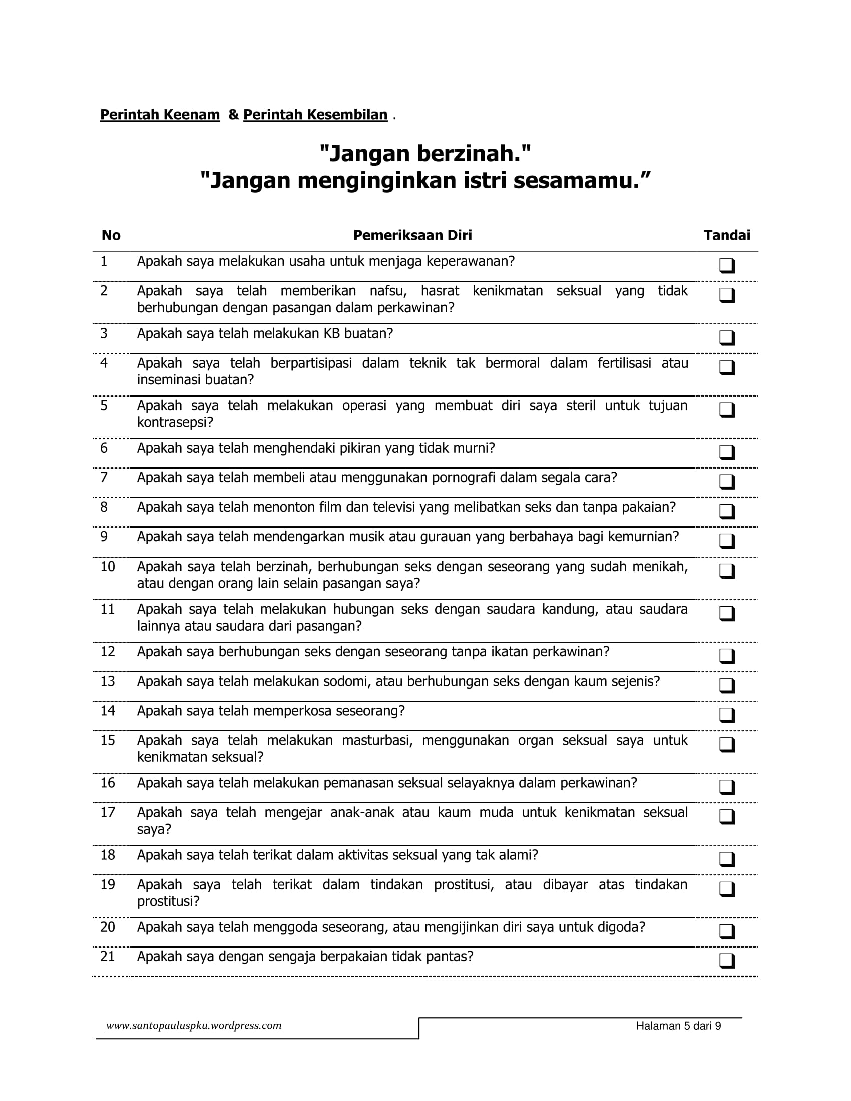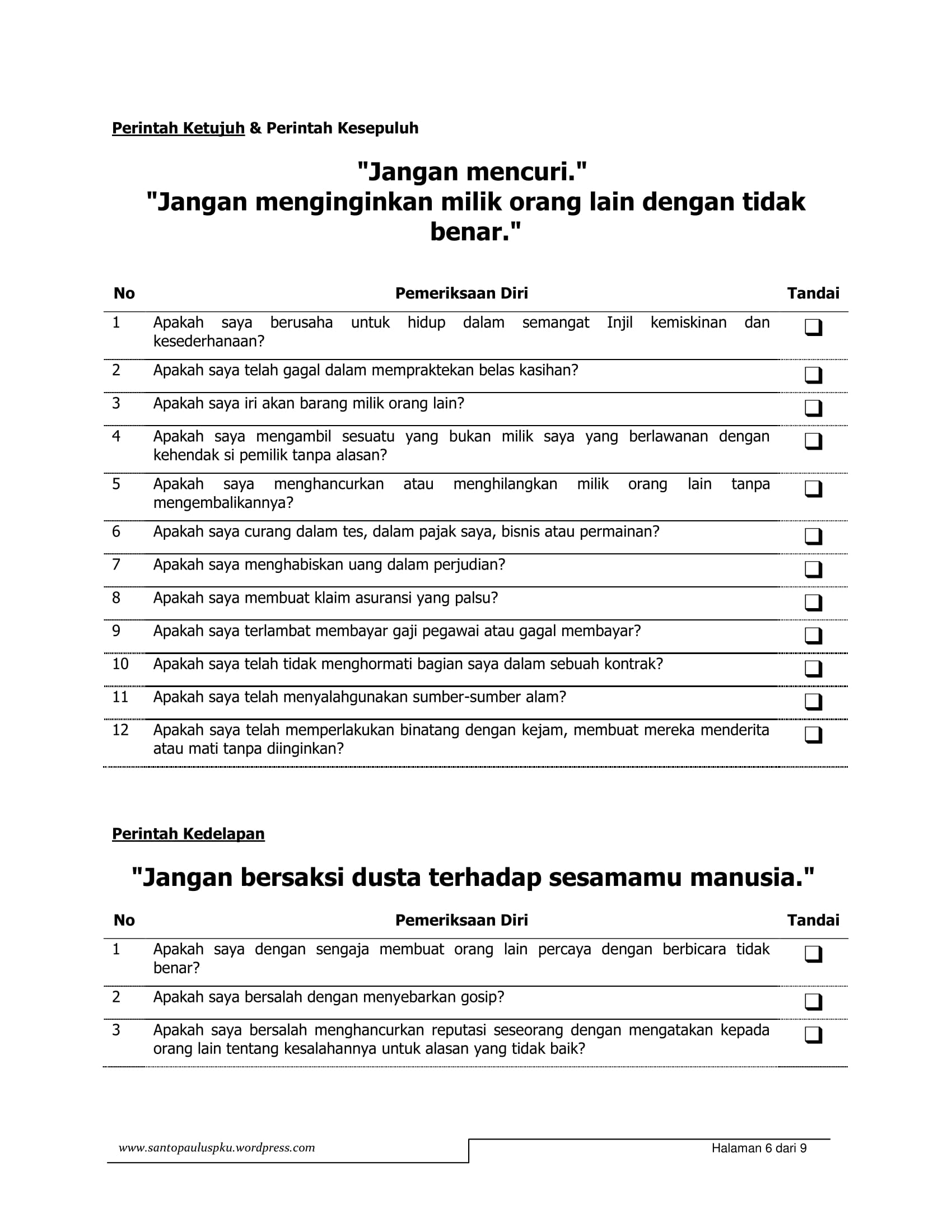 Sumber: Gereja Katolik Santo Paulus, paroki Pekanbaru (https://santopauluspku.files.wordpress.com/2013/02/lembar-latihan-pengakuan-dosa.pdf).