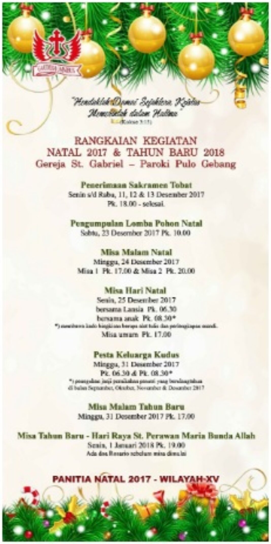 2. Di Gereja: menjadi Sabtu 23 Des pkl 18.00 ( tetap ) & Minggu 24 Des 2017. Pkl. 07.30 (pagi hanya 1x Misa)