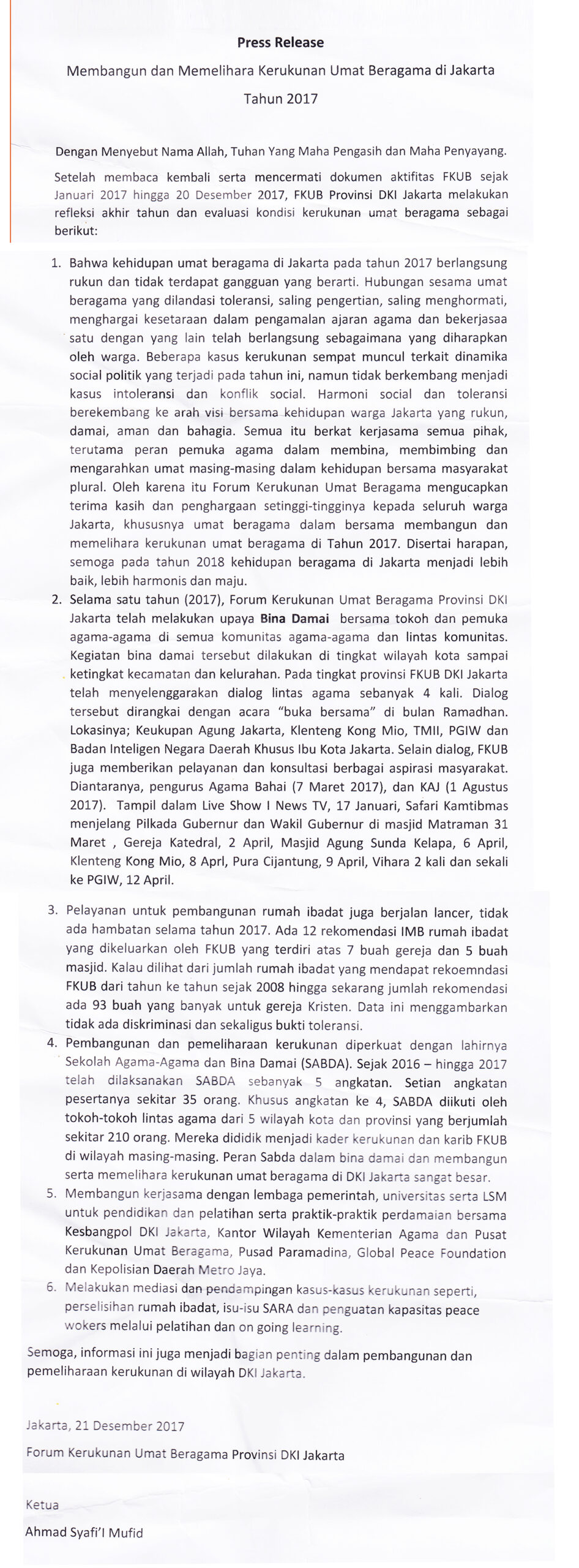 Catatan refleksi ini tertuang didalam lembaran pers release yang dibagikan, berjudul “Membangun dan Memelihara Kerukunan Umat Beragama di Jakarta Tahun 2017”.