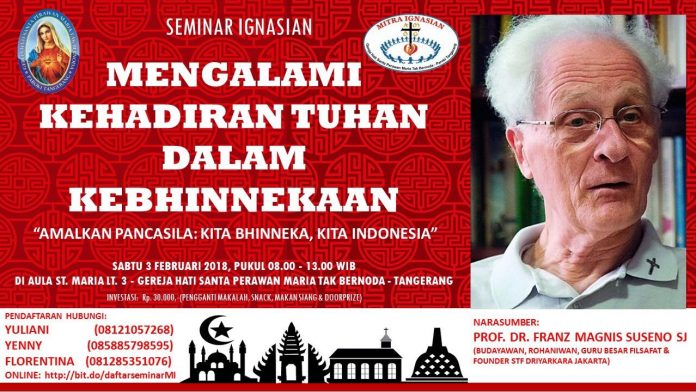 Sabtu, 3 Februari 2018, pujul 8.00 – 13.00 WIB, bertempat di aula St. Maria Lt. 3, Gereja Hati Santa Perawan Maria Tak Bernoda, PAROKI TANGERANG, dengan narasumber: Prof. DR. FRANZ MAGNIZ SUSENO, SJ (Budayawan, Rohaniwan, Guru Besar filsafat dan pendiri STF DRIYAKARYA Jakarta).