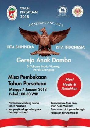 - gereja Anak Domba, St.Yohanes Maria Vianney, paroki Cilangkap, misa pembukaan Tahun Persatuan dimulai pada Minggu 7 Januari pukul 08.30 WIB, disertai dengan menyanyikan lagu kebangsaan dan lagu nasional, dilanjutkan dengan penanaman bibit pohon beringin dan pelepasan burung merpati.