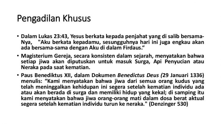 - Pengadilan Khusus • Dalam Lukas 23:43, Yesus berkata kepada penjahat yang di salib bersama- Nya, “Aku berkata kepadamu, sesungguhnya hari ini juga engkau akan ada bersama-sama dengan Aku di dalam Firdaus.“ • Magisterium Gereja, secara konsisten dalam sejarah, menyatakan bahwa setiap jiwa akan diputuskan untuk masuk Surga, Api Penyucian atau Neraka pada saat kematian. • Paus Benediktus XII, dalam Dokumen Benedictus Deus (29 Januari 1336) menulis: “Kami menyatakan bahwa jiwa dari semua orang kudus yang telah meninggalkan kehidupan ini segera setelah kematian individu ada atau akan berada di surga dan memiliki hidup yang kekal; di samping itu kami menyatakan bahwa jiwa orang-orang mati dalam dosa berat aktual segera setelah kematian individu turun ke neraka.” (Denzinger 530)