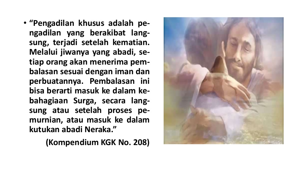 - • “Pengadilan khusus adalah pe- ngadilan yang berakibat lang- sung, terjadi setelah kematian. Melalui jiwanya yang abadi, se- tiap orang akan menerima pem- balasan sesuai dengan iman dan perbuatannya. Pembalasan ini bisa berarti masuk ke dalam ke- bahagiaan Surga, secara lang- sung atau setelah proses pe- murnian, atau masuk ke dalam kutukan abadi Neraka.” (Kompendium KGK No. 208)