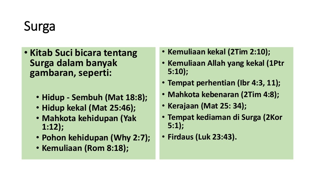 - Surga • Kitab Suci bicara tentang Surga dalam banyak gambaran, seperti: • Hidup – Sembuh (Mat 18:8); • Hidup kekal (Mat 25:46); • Mahkota kehidupan (Yak 1:12); • Pohon kehidupan (Why 2:7); • Kemuliaan (Rom 8:18); • Kemuliaan kekal (2Tim 2:10); • Kemuliaan Allah yang kekal (1Ptr 5:10); • Tempat perhentian (Ibr 4:3, 11); • Mahkota kebenaran (2Tim 4:8); • Kerajaan (Mat 25: 34); • Tempat kediaman di Surga (2Kor 5:1); • Firdaus (Luk 23:43).