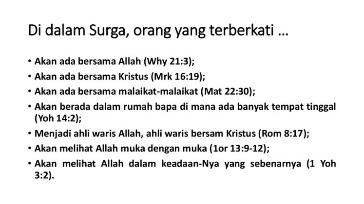 - Di dalam Surga, orang yang terberkati … • Akan ada bersama Allah (Why 21:3); • Akan ada bersama Kristus (Mrk 16:19); • Akan ada bersama malaikat-malaikat (Mat 22:30); • Akan berada dalam rumah bapa di mana ada banyak tempat tinggal (Yoh 14:2); • Menjadi ahli waris Allah, ahli waris bersam Kristus (Rom 8:17); • Akan melihat Allah muka dengan muka (1or 13:9-12); • Akan melihat Allah dalam keadaan-Nya yang sebenarnya (1 Yoh 3:2).