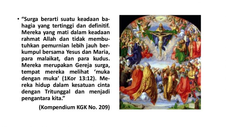 - • “Surga berarti suatu keadaan ba- hagia yang tertinggi dan definitif. Mereka yang mati dalam keadaan rahmat Allah dan tidak membu- tuhkan pemurnian lebih jauh ber- kumpul bersama Yesus dan Maria, para malaikat, dan para kudus. Mereka merupakan Gereja surga, tempat mereka melihat ‘muka dengan muka’ (1Kor 13:12). Me- reka hidup dalam kesatuan cinta dengan Tritunggal dan menjadi pengantara kita.” (Kompendium KGK No. 209)