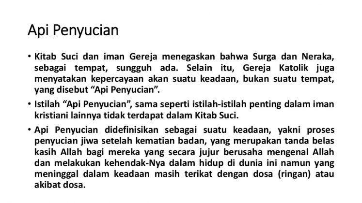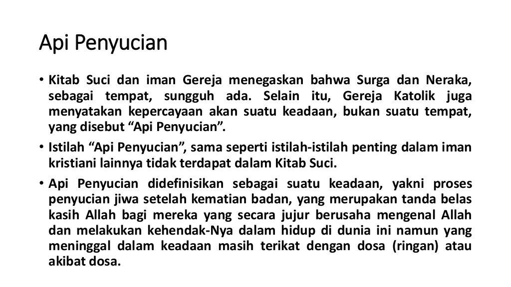 - Api Penyucian • Kitab Suci dan iman Gereja menegaskan bahwa Surga dan Neraka, sebagai tempat, sungguh ada. Selain itu, Gereja Katolik juga menyatakan kepercayaan akan suatu keadaan, bukan suatu tempat, yang disebut “Api Penyucian”. • Istilah “Api Penyucian”, sama seperti istilah-istilah penting dalam iman kristiani lainnya tidak terdapat dalam Kitab Suci. • Api Penyucian didefinisikan sebagai suatu keadaan, yakni proses penyucian jiwa setelah kematian badan, yang merupakan tanda belas kasih Allah bagi mereka yang secara jujur berusaha mengenal Allah dan melakukan kehendak-Nya dalam hidup di dunia ini namun yang meninggal dalam keadaan masih terikat dengan dosa (ringan) atau akibat dosa.