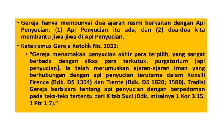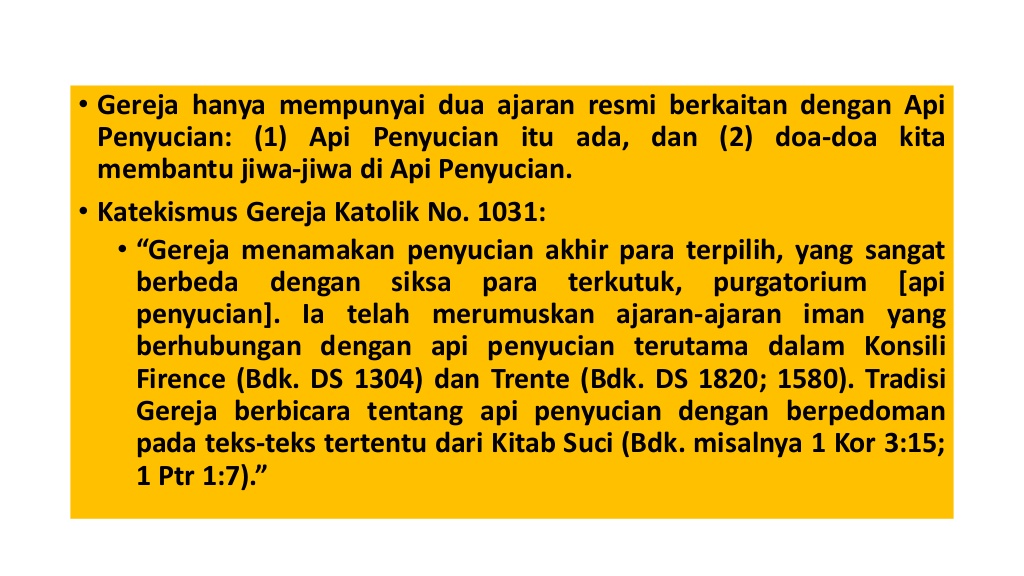- • Gereja hanya mempunyai dua ajaran resmi berkaitan dengan Api Penyucian: (1) Api Penyucian itu ada, dan (2) doa-doa kita membantu jiwa-jiwa di Api Penyucian. • Katekismus Gereja Katolik No. 1031: • “Gereja menamakan penyucian akhir para terpilih, yang sangat berbeda dengan siksa para terkutuk, purgatorium [api penyucian]. Ia telah merumuskan ajaran-ajaran iman yang berhubungan dengan api penyucian terutama dalam Konsili Firence (Bdk. DS 1304) dan Trente (Bdk. DS 1820; 1580). Tradisi Gereja berbicara tentang api penyucian dengan berpedoman pada teks-teks tertentu dari Kitab Suci (Bdk. misalnya 1 Kor 3:15; 1 Ptr 1:7).”