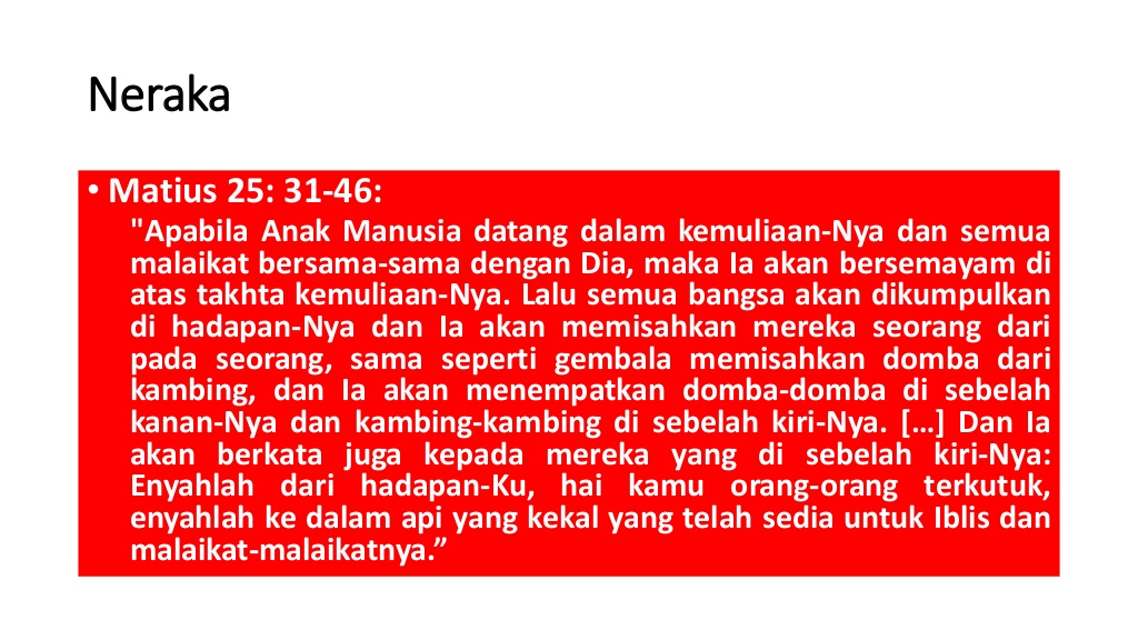 - Neraka • Matius 25: 31-46: “Apabila Anak Manusia datang dalam kemuliaan-Nya dan semua malaikat bersama-sama dengan Dia, maka Ia akan bersemayam di atas takhta kemuliaan-Nya. Lalu semua bangsa akan dikumpulkan di hadapan-Nya dan Ia akan memisahkan mereka seorang dari pada seorang, sama seperti gembala memisahkan domba dari kambing, dan Ia akan menempatkan domba-domba di sebelah kanan-Nya dan kambing-kambing di sebelah kiri-Nya. […] Dan Ia akan berkata juga kepada mereka yang di sebelah kiri-Nya: Enyahlah dari hadapan-Ku, hai kamu orang-orang terkutuk, enyahlah ke dalam api yang kekal yang telah sedia untuk Iblis dan malaikat-malaikatnya.”