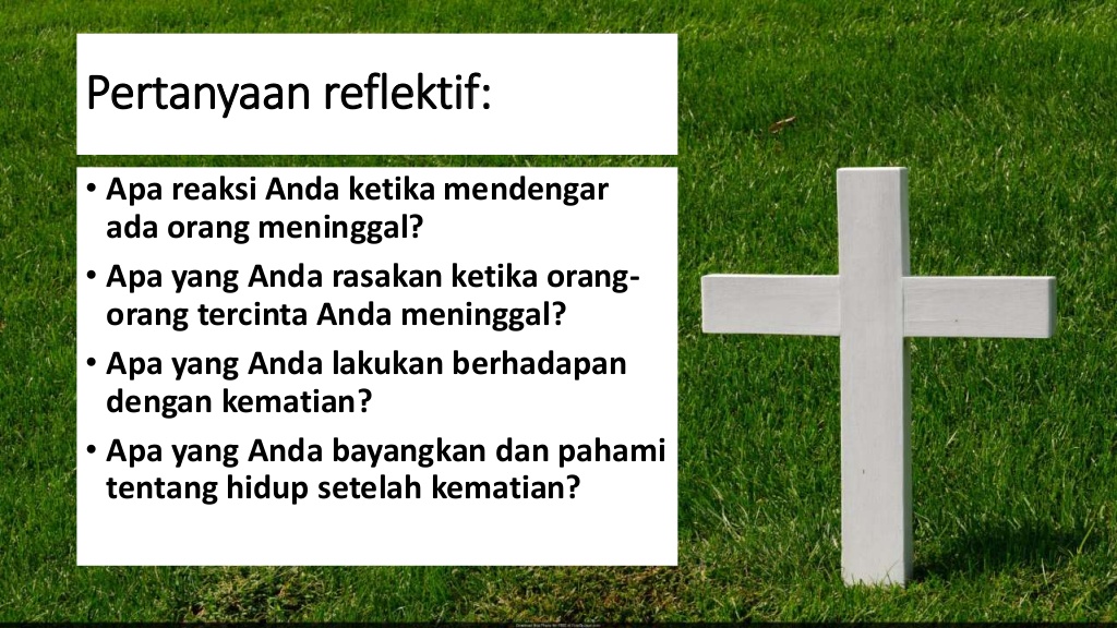 - Pertanyaan reflektif: • Apa reaksi Anda ketika mendengar ada orang meninggal? • Apa yang Anda rasakan ketika orang- orang tercinta Anda meninggal? • Apa yang Anda lakukan berhadapan dengan kematian? • Apa yang Anda bayangkan dan pahami tentang hidup setelah kematian?