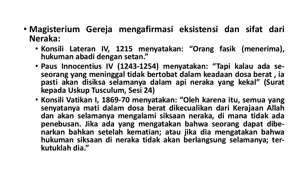- • Magisterium Gereja mengafirmasi eksistensi dan sifat dari Neraka: • Konsili Lateran IV, 1215 menyatakan: “Orang fasik (menerima), hukuman abadi dengan setan.” • Paus Innocentius IV (1243-1254) menyatakan: “Tapi kalau ada se- seorang yang meninggal tidak bertobat dalam keadaan dosa berat , ia pasti akan disiksa selamanya dalam api neraka yang kekal” (Surat kepada Uskup Tusculum, Sesi 24) • Konsili Vatikan I, 1869-70 menyatakan: “Oleh karena itu, semua yang senyatanya mati dalam dosa berat dikecualikan dari Kerajaan Allah dan akan selamanya mengalami siksaan neraka, di mana tidak ada penebusan. Jika ada yang mengatakan bahwa seorang dapat dibe- narkan bahkan setelah kematian; atau jika dia mengatakan bahwa hukuman siksaan di neraka tidak akan berlangsung selamanya; ter- kutuklah dia.”