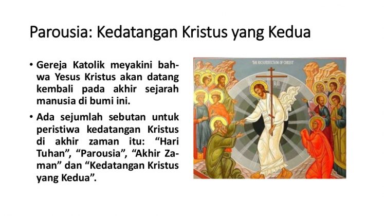 - Parousia: Kedatangan Kristus yang Kedua • Gereja Katolik meyakini bah- wa Yesus Kristus akan datang kembali pada akhir sejarah manusia di bumi ini. • Ada sejumlah sebutan untuk peristiwa kedatangan Kristus di akhir zaman itu: “Hari Tuhan”, “Parousia”, “Akhir Za- man” dan “Kedatangan Kristus yang Kedua”.