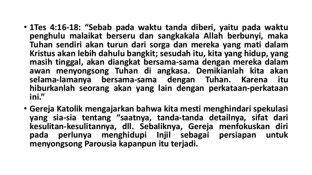 - • 1Tes 4:16-18: “Sebab pada waktu tanda diberi, yaitu pada waktu penghulu malaikat berseru dan sangkakala Allah berbunyi, maka Tuhan sendiri akan turun dari sorga dan mereka yang mati dalam Kristus akan lebih dahulu bangkit; sesudah itu, kita yang hidup, yang masih tinggal, akan diangkat bersama-sama dengan mereka dalam awan menyongsong Tuhan di angkasa. Demikianlah kita akan selama-lamanya bersama-sama dengan Tuhan. Karena itu hiburkanlah seorang akan yang lain dengan perkataan-perkataan ini.” • Gereja Katolik mengajarkan bahwa kita mesti menghindari spekulasi yang sia-sia tentang “saatnya, tanda-tanda detailnya, sifat dari kesulitan-kesulitannya, dll. Sebaliknya, Gereja menfokuskan diri pada perlunya menghidupi Injil sebagai persiapan untuk menyongsong Parousia kapanpun itu terjadi.