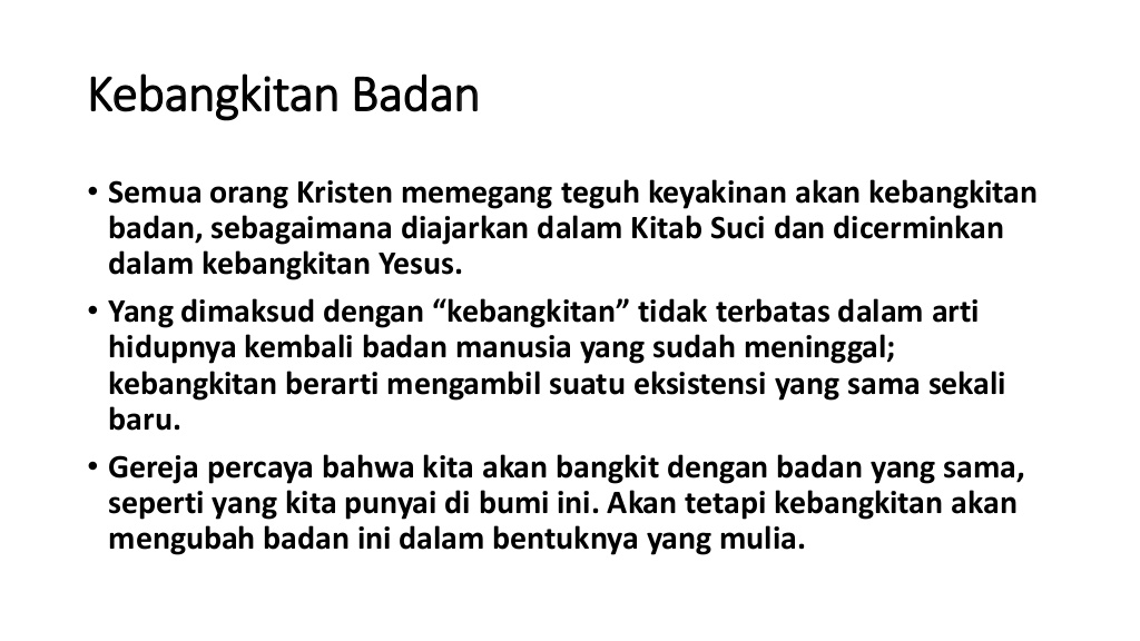 - Kebangkitan Badan • Semua orang Kristen memegang teguh keyakinan akan kebangkitan badan, sebagaimana diajarkan dalam Kitab Suci dan dicerminkan dalam kebangkitan Yesus. • Yang dimaksud dengan “kebangkitan” tidak terbatas dalam arti hidupnya kembali badan manusia yang sudah meninggal; kebangkitan berarti mengambil suatu eksistensi yang sama sekali baru. • Gereja percaya bahwa kita akan bangkit dengan badan yang sama, seperti yang kita punyai di bumi ini. Akan tetapi kebangkitan akan mengubah badan ini dalam bentuknya yang mulia.