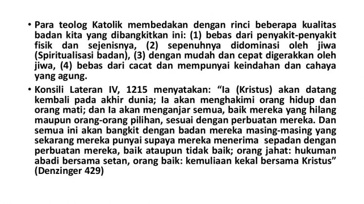 - • Para teolog Katolik membedakan dengan rinci beberapa kualitas badan kita yang dibangkitkan ini: (1) bebas dari penyakit-penyakit fisik dan sejenisnya, (2) sepenuhnya didominasi oleh jiwa (Spiritualisasi badan), (3) dengan mudah dan cepat digerakkan oleh jiwa, (4) bebas dari cacat dan mempunyai keindahan dan cahaya yang agung. • Konsili Lateran IV, 1215 menyatakan: “Ia (Kristus) akan datang kembali pada akhir dunia; Ia akan menghakimi orang hidup dan orang mati; dan Ia akan menganjar semua, baik mereka yang hilang maupun orang-orang pilihan, sesuai dengan perbuatan mereka. Dan semua ini akan bangkit dengan badan mereka masing-masing yang sekarang mereka punyai supaya mereka menerima sepadan dengan perbuatan mereka, baik ataupun tidak baik; orang jahat: hukuman abadi bersama setan, orang baik: kemuliaan kekal bersama Kristus” (Denzinger 429)