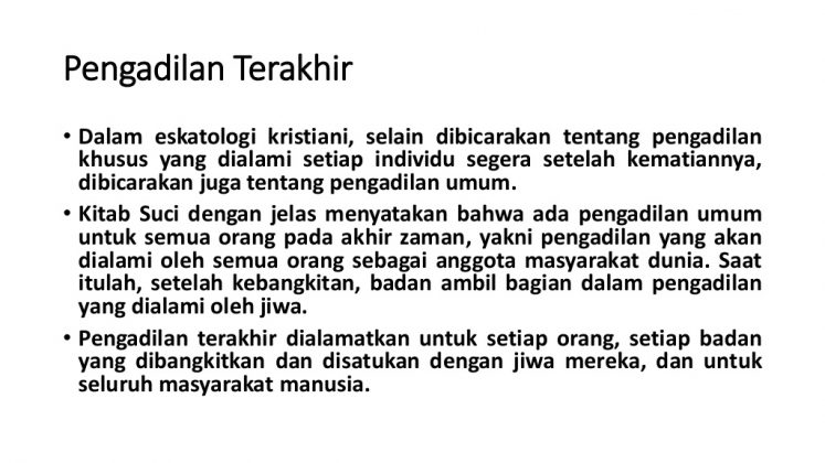 - Pengadilan Terakhir • Dalam eskatologi kristiani, selain dibicarakan tentang pengadilan khusus yang dialami setiap individu segera setelah kematiannya, dibicarakan juga tentang pengadilan umum. • Kitab Suci dengan jelas menyatakan bahwa ada pengadilan umum untuk semua orang pada akhir zaman, yakni pengadilan yang akan dialami oleh semua orang sebagai anggota masyarakat dunia. Saat itulah, setelah kebangkitan, badan ambil bagian dalam pengadilan yang dialami oleh jiwa. • Pengadilan terakhir dialamatkan untuk setiap orang, setiap badan yang dibangkitkan dan disatukan dengan jiwa mereka, dan untuk seluruh masyarakat manusia.
