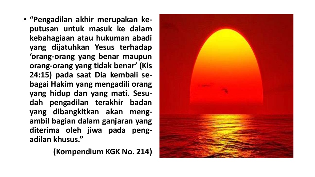 - • “Pengadilan akhir merupakan ke- putusan untuk masuk ke dalam kebahagiaan atau hukuman abadi yang dijatuhkan Yesus terhadap ‘orang-orang yang benar maupun orang-orang yang tidak benar’ (Kis 24:15) pada saat Dia kembali se- bagai Hakim yang mengadili orang yang hidup dan yang mati. Sesu- dah pengadilan terakhir badan yang dibangkitkan akan meng- ambil bagian dalam ganjaran yang diterima oleh jiwa pada peng- adilan khusus.” (Kompendium KGK No. 214)