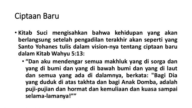 - Ciptaan Baru • Kitab Suci mengisahkan bahwa kehidupan yang akan berlangsung setelah pengadilan terakhir akan seperti yang Santo Yohanes tulis dalam vision-nya tentang ciptaan baru dalam Kitab Wahyu 5:13: • “Dan aku mendengar semua makhluk yang di sorga dan yang di bumi dan yang di bawah bumi dan yang di laut dan semua yang ada di dalamnya, berkata: “Bagi Dia yang duduk di atas takhta dan bagi Anak Domba, adalah puji-pujian dan hormat dan kemuliaan dan kuasa sampai selama-lamanya!””
